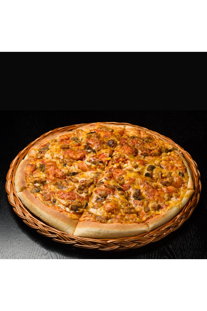 Dollys tomatsaus og osteblanding, marinert kylling, hvitløk, løk, mais, ovnsbakt marinert sjampinjong og kreolsk krydder